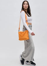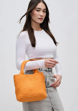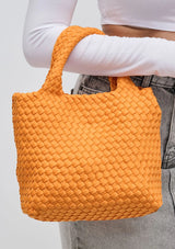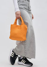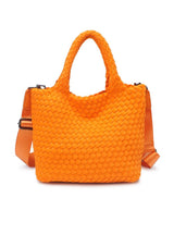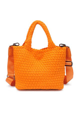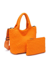 The Sky's The Limit Small Crossbody Tote is crafted from intricately woven neoprene. This crossbody features a versatile design includes a detachable crossbody strap and a matching pouch