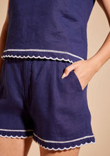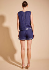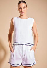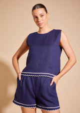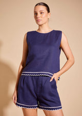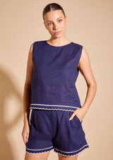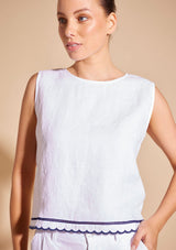 The Odette Top from Alessandra features a sleeveless design with a crew neckline, exposed gold back zip opening and scalloped hemline with contrast coloured trim detail. This slightly cropped top is crafted from 100% Linen; a non-stretch fabrication that is breathable and ideal for everyday wear.