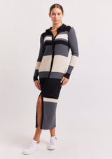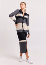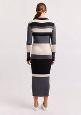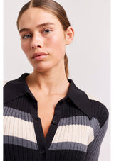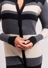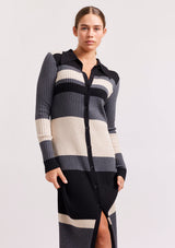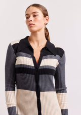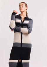 The Shelby Dress from Alessandra features a collar with button closure, full length sleeves and contrast colour striped detail. This ribbed designer dress is crafted from a Cotton and Cashmere blend.