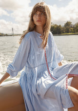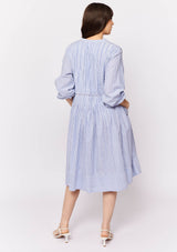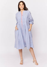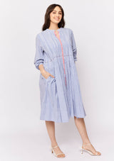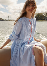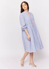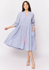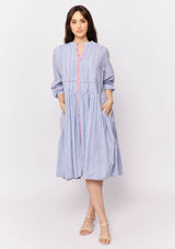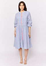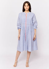 The Arabesque Dress from Alessandra features a centre front button opening with contrast colour, full length blouson sleeves and feminine pintuck detailing. This dress is crafted from 100% linen; a non-stretch fabrication that is breathable and ideal for everyday wear.