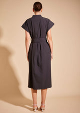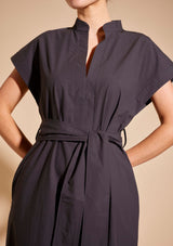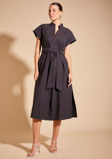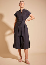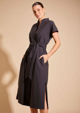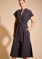 The Aviva Dress from Alessandra features a stand collar with a V-split centre front, cap turn back sleeve, side pockets, belt loops with a sash belt and side splits at the hem. This midi-length dress is crafted from 100% Cotton, a non-stretch fabrication that is breathable and ideal for everyday wear.