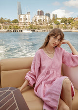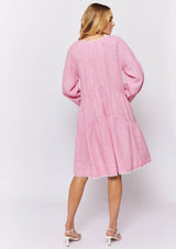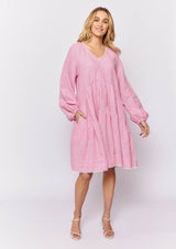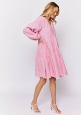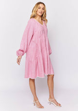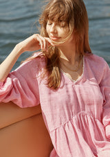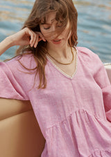 The Baroque Dress from Alessandra features a v-neckline and blouson sleeves with gathered tiers. This relaxed dress is crafted from 100% Linen; a non-stretch fabrication that is breathable and ideal for everyday wear.