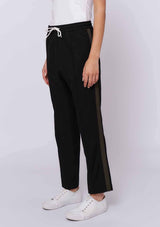 The Black Tie Pant from Alessandra features an elastic waist with drawcord, side pockets, a straight leg with contrast colour stripe which slightly narrows down at the hem.