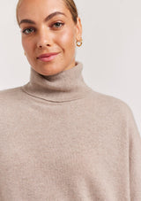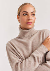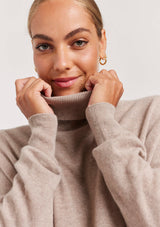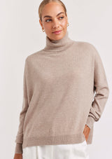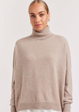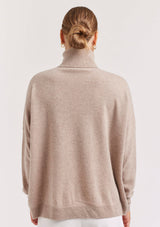 The A Polo Bay Sweater from Alessandra features a boxy oversized design with turtleneck, full length sleeves and ribbed detailing on the cuff and hemline. This designer sweater is crafted from 100% Cashmere.