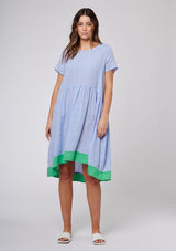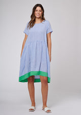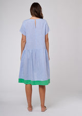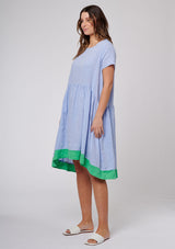 The Celeste Dress by Alessandra is crafted from 100% Linen and features a crew neckline with a cap sleeve, swing shape body with high/low hem and contrast stripe on bottom hem.