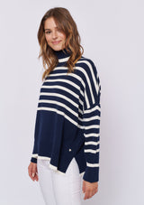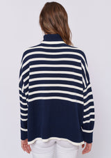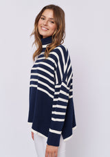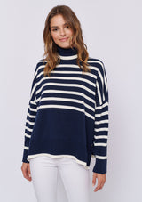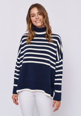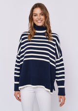 The Chalet Sweater from Alessandra features a relaxed design with a high neck, long sleeves and a dropped shoulder. This striped boxy sweater is crafted from a 100% Cotton.