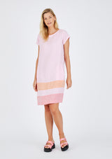 The Connie Dress by Alessandra is crafted from 100% Linen and features a round neckline with set in cap sleeves, pockets and a relaxed straight silhouette. The lower half of the dress has been spliced with a marine inspired palette.