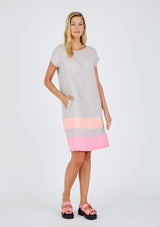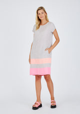 The Connie Dress by Alessandra is crafted from 100% Linen and features a round neckline with set in cap sleeves, pockets and a relaxed straight silhouette. The lower half of the dress has been spliced with a marine inspired palette.