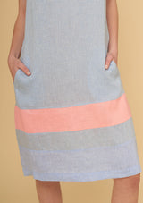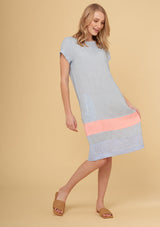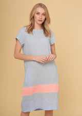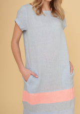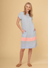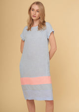 The Connie Dress by Alessandra features a crew neck with set-in cap sleeves, side pockets and a straight t-shirt shaped silhouette with spliced colour detail at the hem. This feminine dress is crafted from 100% Linen, a non-stretch fabrication that is breathable and ideal for everyday wear.