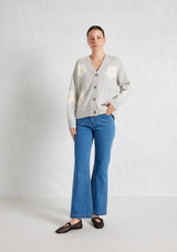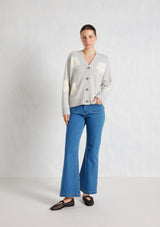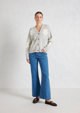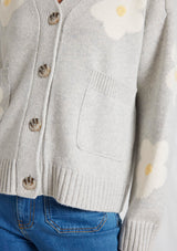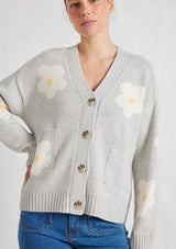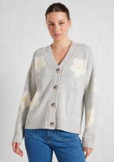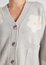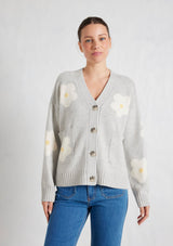 The Daisy Cardigan from Alessandra features a V-neckline, button front opening, full length sleeves, patch pockets and daisy knit design, this cardigan is both functional and fashionable. Made from a luxurious wool and cashmere blend, it's perfect for layering on chilly days.