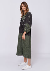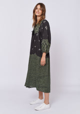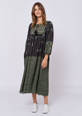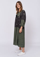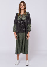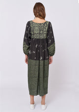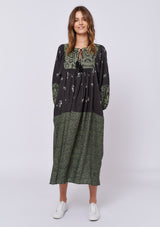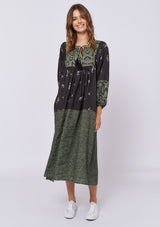 The Dandelion Dress by Alessandra is crafted from 100% Linen and features a wide neckline with tassel tie, ¾ length blouson sleeves and spliced with different prints throughout the mid length dress.