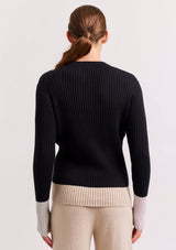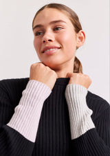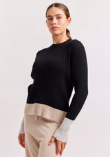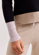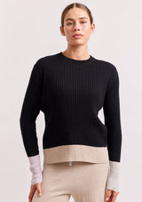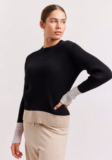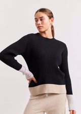 The Eclaire Top from Alessandra features a crew neckline, full length sleeves and contrast colour detailing on the cuffs and hemline. This ribbed designer sweater is crafted from a Cotton and Cashmere blend.