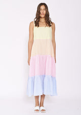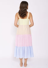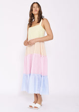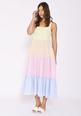 The Fiesta Seersucker Dress by Alessandra features a square neckline style bodice with straps and a spliced colour tiered body with ruffle detail. This maxi length dress is crafted from 100% cotton seersucker; a non-stretch fabrication with a subtle stripe.
