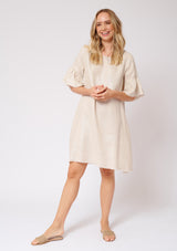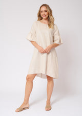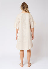 The Frayed Edge Dress from Alessandra, is crafted from 100% Linen. It features a set in sleeve with ruffle and frayed edge, a-line body and invisible zip back neck.