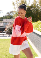 The Gala Sweater by Alessandra features a knitted boxy design with a crew neckline, full length sleeves and ribbed detailing on the neck, cuffs and hemline. This colour spliced designer sweater is crafted from a luxurious Cotton and Cashmere blend.