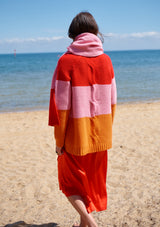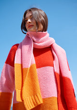 The Gemini Scarf features a knitted three tone colour block finished with ribbed detailing. This designer scarf is crafted from a Wool/Cashmere blend.