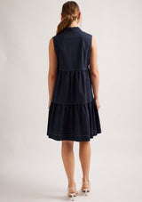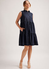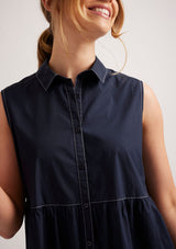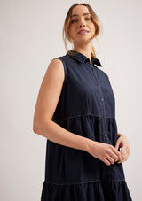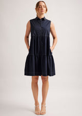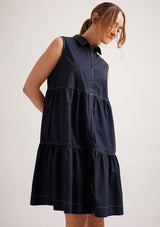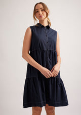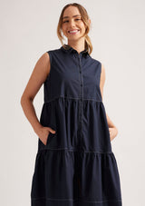 The Harper Dress from Alessandra features a sleeveless design with a shirt collar, centre front button opening, tiered layers with gathering and contrast stitching detail throughout the dress. Crafted from 100% cotton, providing optimum comfort and breathability throughout the day.