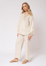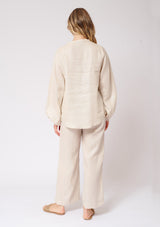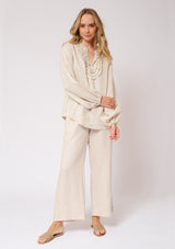 The Frayed Edge Dress from Alessandra, is crafted from 100% Linen. It features a slight bell bottom, ruffled detailing with buttons and balloon sleeves.