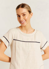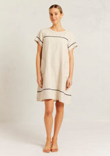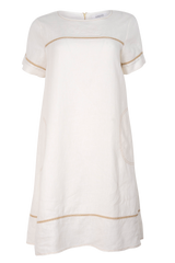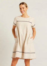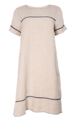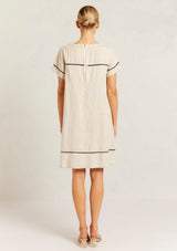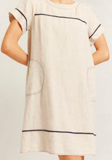 The Laine Dress from Alessandra showcases a crew neckline, short sleeves, side pockets and an exposed back zipper. This charming A-line dress features contrast topstitching and ladder trimming for a touch of playful elegance. Crafted from 100% linen, it blends a chic polished look with a free-spirited feel making it the ideal choice for everyday wear.