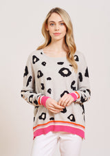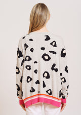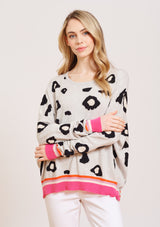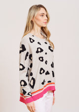 The Alessandra Leopard Love Sweater features a relaxed boxy design with crew neck, long sleeves, dropped shoulder, high-low hemline with side splits and contrasting trims. This boxy sweater is crafted from a Egyptian Cotton / Cashmere blend.