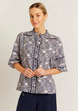 The Lia Shirt Raya from Alessandra features a round frill neckline, button down placket, ¾ sleeve blouson sleeves with elasticated cuffs and lace trim details. Crafted from 100% linen, this floral printed shirt offers excellent breathability, making it an ideal choice for staying cool during the warmer weather.