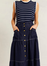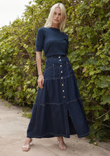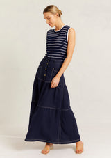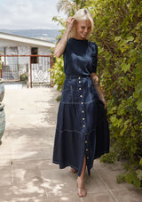 The Lotus Skirt from Alessandra features a tiered, A-line silhouette with a flat front and elasticated back waist, button front opening and front pocket details. Crafted from 100% linen, this maxi-length skirt offers excellent breathability, making it an ideal choice for staying cool during the warmer weather.
