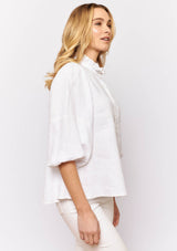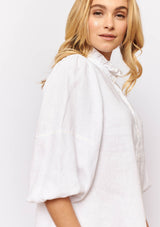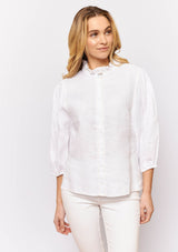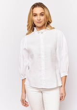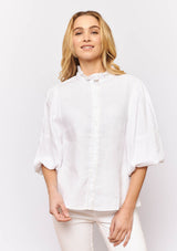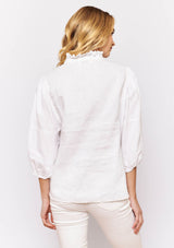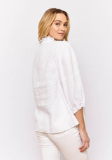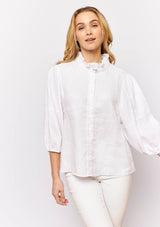 The Lume Shirt from Alessandra features a ruffled collar with button down closure and ¾ length blouson sleeves. This shirt is crafted from 100% linen; a non-stretch fabrication that is breathable and ideal for everyday wear.