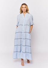 The Martina Dress by Alessandra is crafted from 100% Linen and features a high neckline with a button tab centre front, ¾ puff sleeves and a tiered layers with striped colour detail.