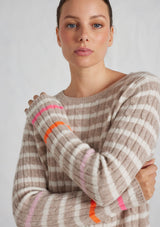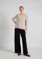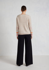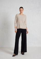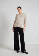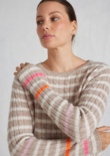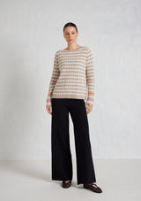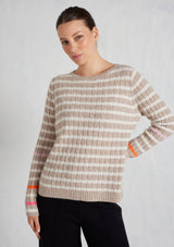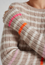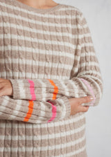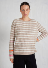 The Nora Sweater from Alessandra features a crew neck, set-in sleeves and a timeless striped design. The ribbed neck, cuffs and hem add a touch of texture. Crafted from 100% Cashmere, this medium weight cable knit offers both warmth and softness, ensuring comfort during chilly days.