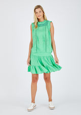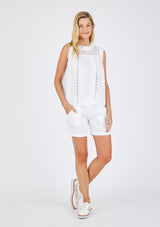 The Alessandra Penelope Top is crafted from 100% Linen, a non-stretch fabrication. This Top features lace detailing across the chest with ruffled collar and keyhole opening at the centre back.