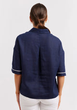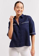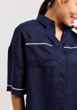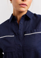 The Pippa Shirt from Alessandra features a shirt collar, button down opening, short sleeves, patch pockets and a pleat on the back. Elevated white embroidery detail on the pockets and sleeves creates a feminine style. This classic shirt is crafted from 100% linen, a non-stretch fabrication that is breathable and ideal for everyday wear.