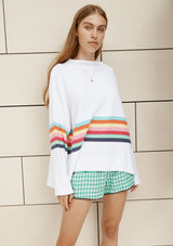 The Alessandra Rainbow Bree Sweater features a chunky weight knit with a rolled polo neck, long sleeves and a dropped shoulder. This boxy sweater is crafted from a 100% Cotton and has a rainbow stripe detail across the waist.