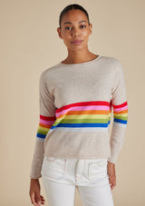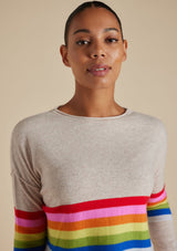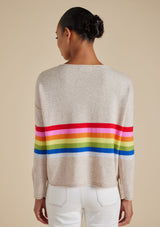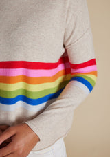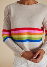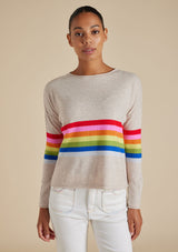 The Sally Sweater from Alessandra features a high crew neckline, dropped shoulder with reverse seam, full length sleeves and rolled design detail on the neck, cuffs and hemline. This sweater is crafted from a wool and cashmere blend with a rainbow stripe detail under the bust, adding a pop of colour to your wardrobe.
