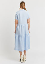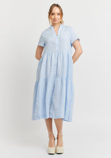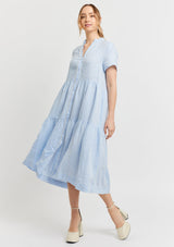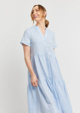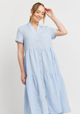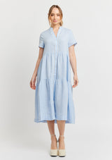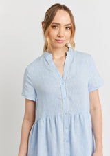 The Sante Dress by Alessandra features a stand collar, V-neckline, button through front placket with embroidered detail, short sleeves, side pockets and tiered layers.  This dress is crafted from 100% Linen, a non-stretch fabrication that is breathable and ideal for everyday wear.