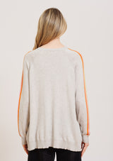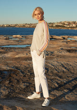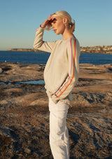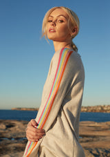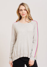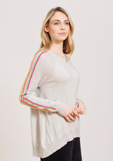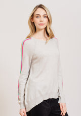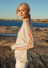 The Alessandra Sorbet Stripe Sweater features a relaxed boxy design with crew neck, raglan sleeves, and contrasting rainbow detailing down the arm. This boxy sweater is crafted from a Egyptian Cotton / Cashmere blend.