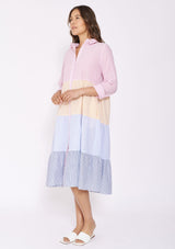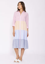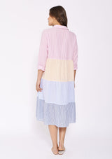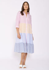 The Spliced Hazel Seersucker Dress by Alessandra features a collar with centre front placket button opening, long sleeves and a spliced colour body. This tiered shirt dress is crafted from 100% cotton seersucker; a non-stretch fabrication with a subtle stripe.