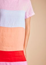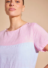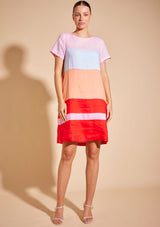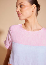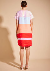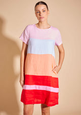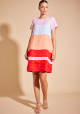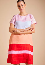 The Swing Connie Dress from Alessandra features a crew neckline with a keyhole back opening, short sleeves, side pockets, spliced contrast colour detail and a relaxed silhouette with a swing hem. This knee length shift dress is crafted from 100% Linen; a non-stretch fabrication that is breathable and ideal for everyday wear.