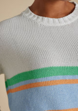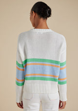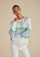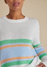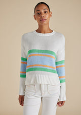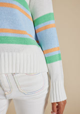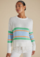 The Trish Sweater from Alessandra features a high crew neckline, full length sleeves and ribbed detailing on the neck, cuffs and hemline. Crafted from 100% Cotton, this colourfully striped sweater not only adds a pop of colour to your wardrobe but also keeps you comfortable with its light weight and breathable design.