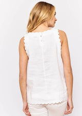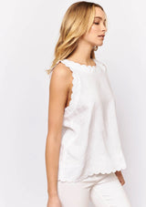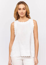 The Twiggy Top from Alessandra features a flattering crew neckline with scalloped detailing throughout. This top is crafted from 100% Linen; a non-stretch fabrication that is breathable and ideal for everyday wear.