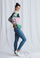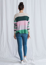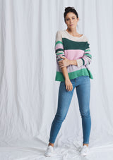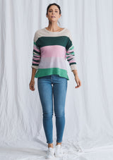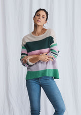 The Alessandra Whitney Stripe Sweater features a relaxed box shaped design with crew neck, drop shoulder, long sleeves and a slight high-low hemline. This designer sweater is crafted from 100% Cashmere.