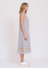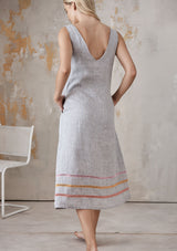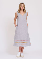 The Maxi Monaco Dress by Alessandra is crafted from 100% Linen and features a V-neckline, pockets, multi-coloured faggoting trim detail and sleeveless swing shaped silhouette.