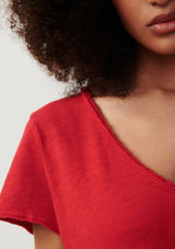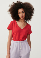 The Sonoma T-Shirt by American Vintage features a V neckline, short sleeves and slightly cropped rolled hemline. It is crafted from 100% Cotton and has a soft fleck finish in the fabrication.