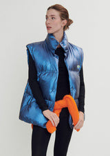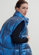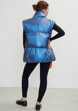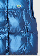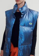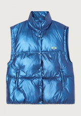 The Tymbay Padded Sleeveless Jacket from American Vintage features a high standing collar, centre front press stud fastening, welted zip pockets and "La Maison AMV" logo patch logo on the front. This oversized, iridescent coloured jacket is expertly quilted with warm padding and designed to ensure maximum comfort.