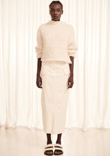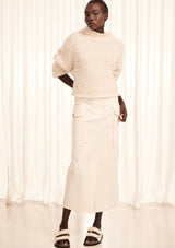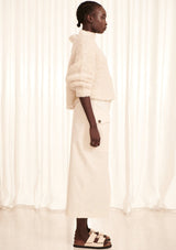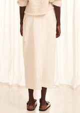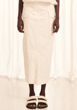 The Anya Skirt from Apartment Clothing features a waistband with zip closure, patch pocket detail and front centre seam split from knee to hem. This skirt is crafted from 100% cotton; which is lightweight and a perfect addition to your seasonal wardrobe.