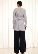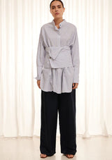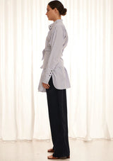 The Pinstripe Obi Shirt from Apartment Clothing features a stand collar with with button through closure through the centre front, full length sleeves with turnback cuff and 4 button closure and a fixed obi belt with feature tortoiseshell double button closure. This is longline relaxed fit shirt is a gorgeous update of a wardrobe classic and crafted from 100% Cotton.