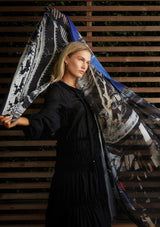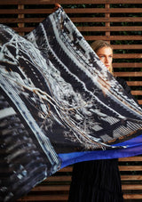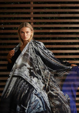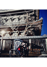 The Bird & Knoll Kyoto | Twilight Pagoda is crafted from a Cashmere-Modal blend. This scarf features a charming and nostalgic streetscape dotted with traditional old houses in the Higashiyama district of Kyoto.