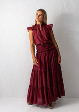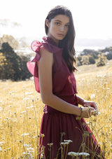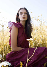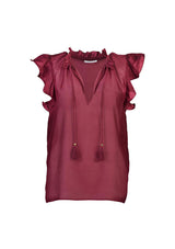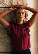 The Mathilde Top by Bird & Knoll crafted from a lightweight cotton silk blend, which is a non-stretch fabrication. This top feature an exaggerated double ruffle sleeve, ruffle and shirring detailed neckline and front necktie closure with tassel and gold bead embellishment.