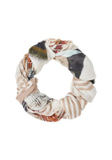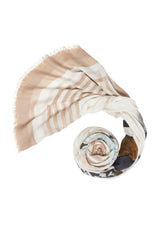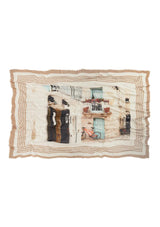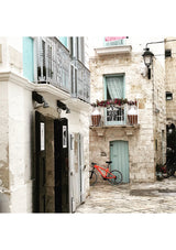The Bird & Knoll Puglia | Bike Lane Scarf is crafted from a Cashmere-Modal Blend. It features the white-washed lanes of Polignano a Mare in Puglia, dotted with pastel doorways, sprinkled with colour pops of bicycles and potted flowers.