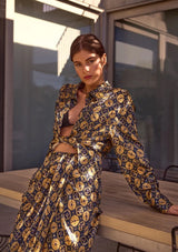 The Ella Classic Silk Shirt from Caravan & Co. features a standard shirt collar and a front placket with button closure. It includes full-length sleeves with cuffs and a slightly curved hem with side splits. Crafted from a luxurious silk and cotton blend, this shirt showcases the exclusive Ella print, offering a refined yet casual modern look.