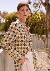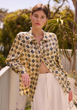 CT305EThe Ella Classic Silk Shirt from Caravan & Co. features a standard shirt collar and a front placket with button closure. It includes full-length sleeves with cuffs and a slightly curved hem with side splits. Crafted from a luxurious silk and cotton blend, this shirt showcases the exclusive Ella print, offering a refined yet casual modern look.